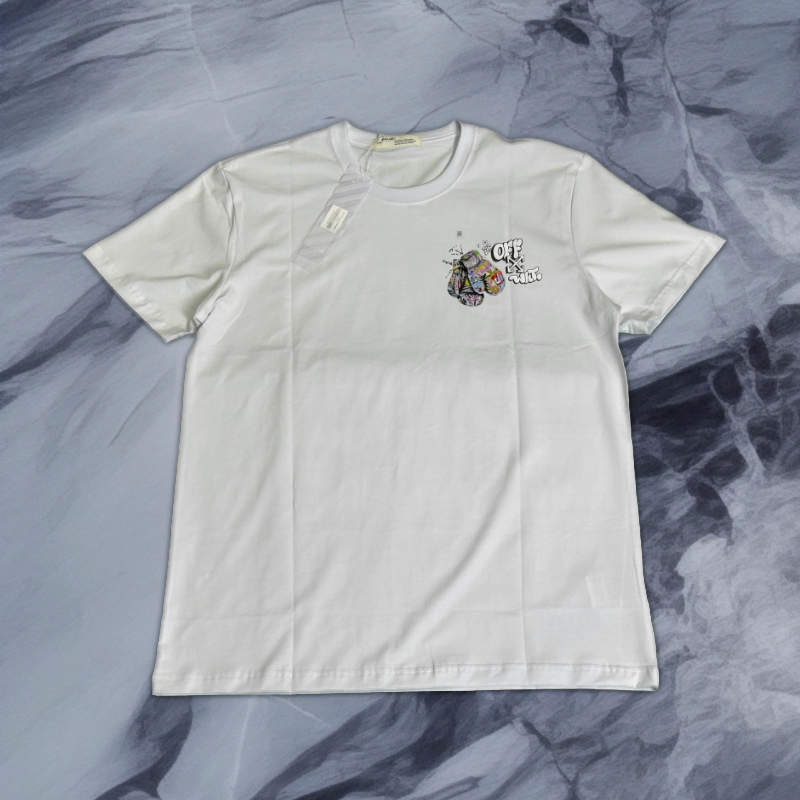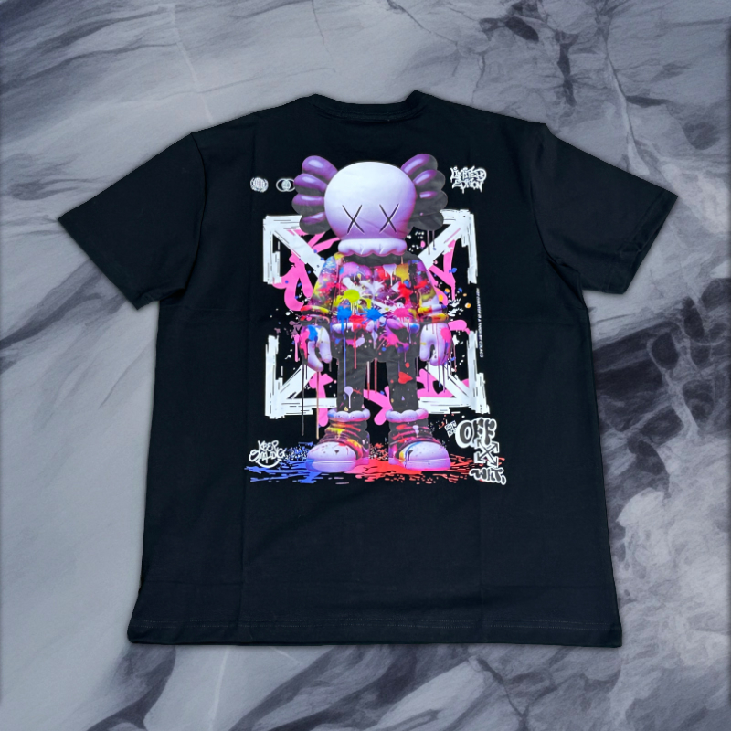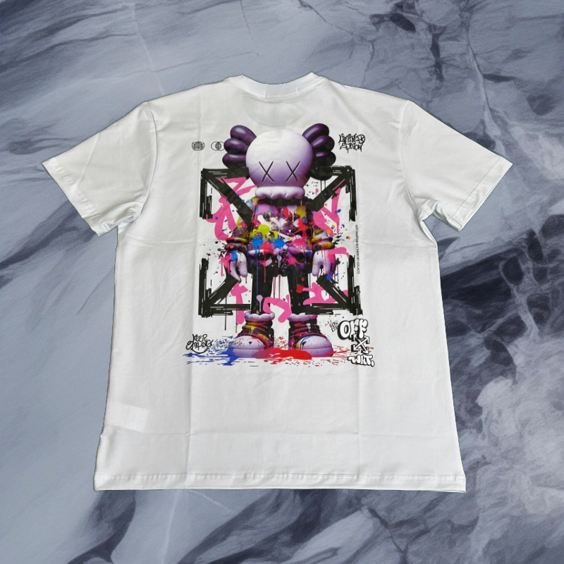 เสื้อยืดoff-whiteสกรีนลายนวมตกแต่งด้วยสีสันสดใสตรงอกซ้าย ด้านหลังมีมาสคอร์ตของออฟไวท์ประดับด้วยสีสัน